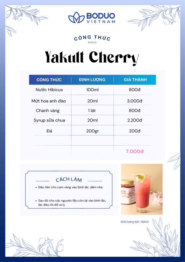 - Thành phần mứt hoa anh đào: Xi-rô ngô fructose cao, nước, đường trắng, xi-rô glucose, mật ong, nước ép táo cô đặc, hoa hồng, chất nhũ hoá (Pectin – INS 440), chất điều chỉnh độ acid (Calcium Lactate – INS 327, Acid Citric – INS 330), chất bảo quản (Potassium sorbate – INS 202), màu tổng hợp (Ponceau 4R – INS 124), hương hoa anh đào tự nhiên.