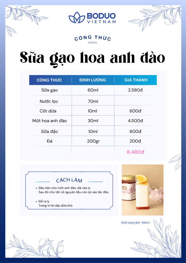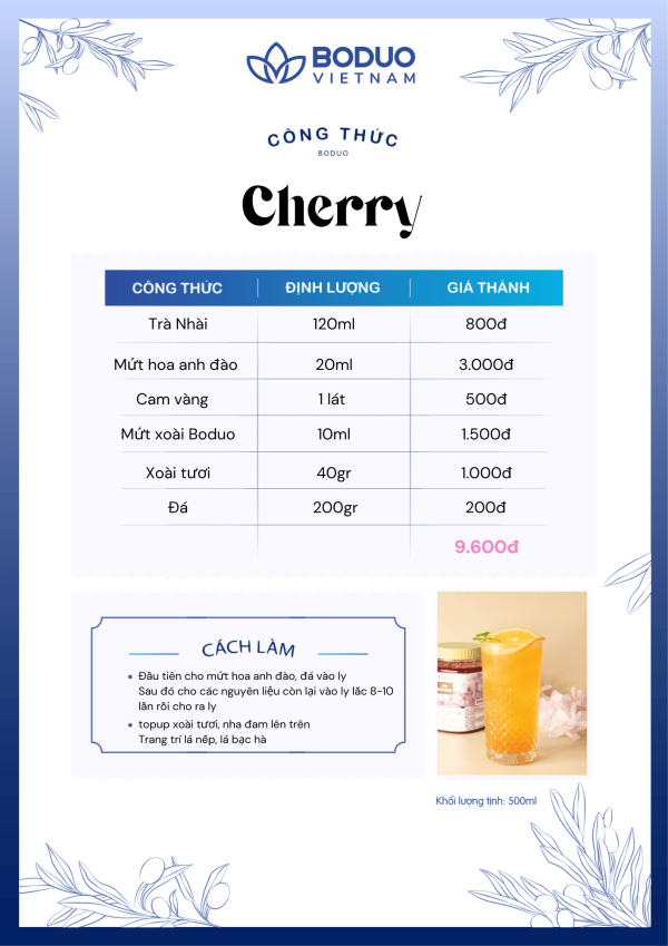 - Thành phần mứt hoa anh đào: Xi-rô ngô fructose cao, nước, đường trắng, xi-rô glucose, mật ong, nước ép táo cô đặc, hoa hồng, chất nhũ hoá (Pectin – INS 440), chất điều chỉnh độ acid (Calcium Lactate – INS 327, Acid Citric – INS 330), chất bảo quản (Potassium sorbate – INS 202), màu tổng hợp (Ponceau 4R – INS 124), hương hoa anh đào tự nhiên.